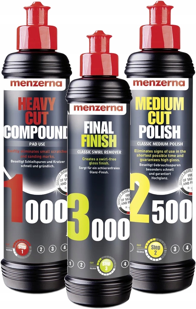 Uniwersalny zestaw past polerskich pozwalający przeprowadzić pełną korektę lakieru w 3 krokach.