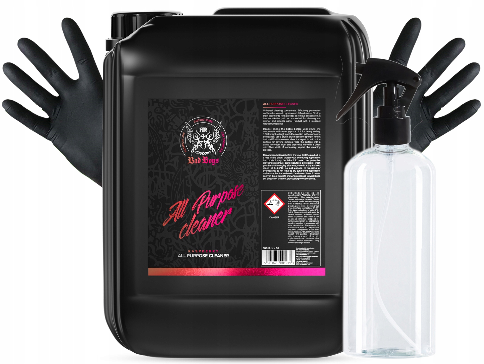 RR Customs Bad Boys All Purpose Cleaner APC to uniwersalny koncentrat czyszczący, który skutecznie wnika, rozbija brud, smar, trudne plamy i utrwalone zabrudzenia. Wiąże je, tworząc łatwą do usunięcia zawiesinę. Produkt wymaga rozcieńczenia! Posiada zasadowe pH. Pracę uprzyjemni intensywny, malinowy zapach.
