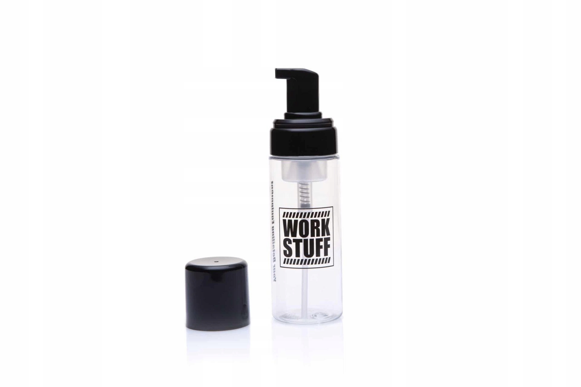 Work Stuff Foam Bottle to bardzo wytrzymała, przezroczysta butelka z pompką pianotwórczą o pojemności 150ml. Stworzona do użytku z produktami do czyszczenia skóry oraz APC. Wykonana z materiału typu PET.