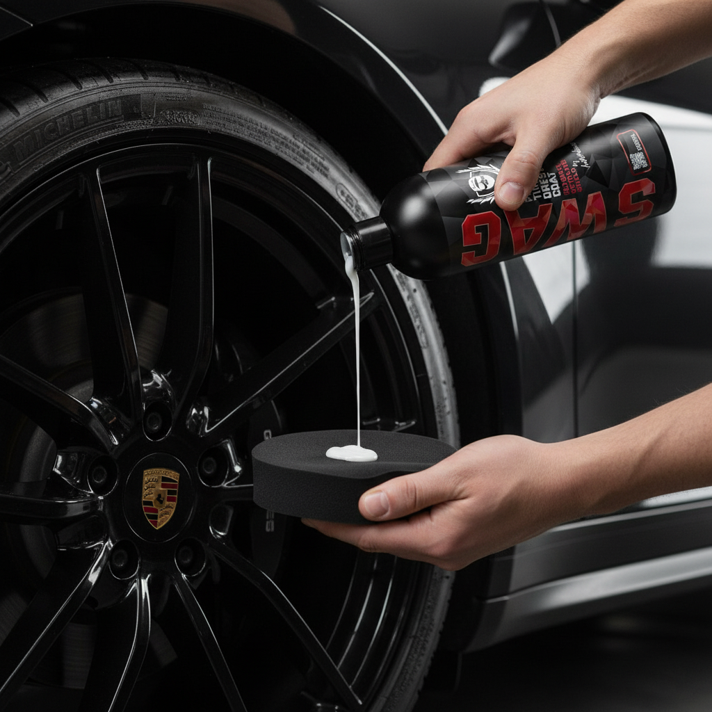 Swag CERAMIC PLASTIC TIRE DRESSING COAT to zaawansowany ceramiczny dressing ochronny do zewnętrznych elementów samochodu wykonanych z gum, winylu i tworzyw sztucznych. Dzięki zawartości aktywnych cząsteczek SiO₂, tworzy na powierzchni trwałą, hydrofobową warstwę, która skutecznie zabezpiecza przed promieniowaniem UV, solą drogową i zabrudzeniami.