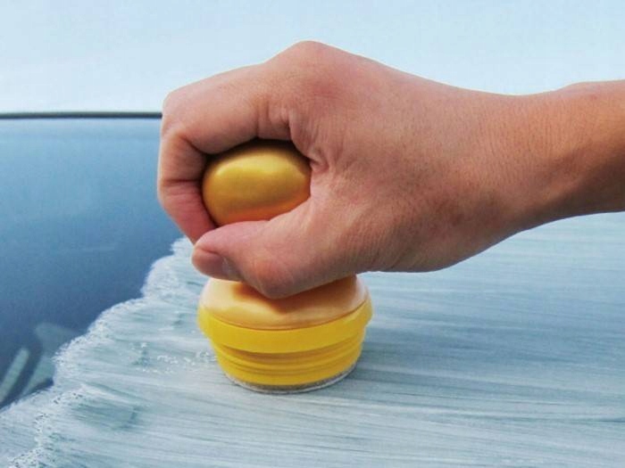 - Przyłóż produkt filcem do szyby i ściśnij rączkę dwa razy