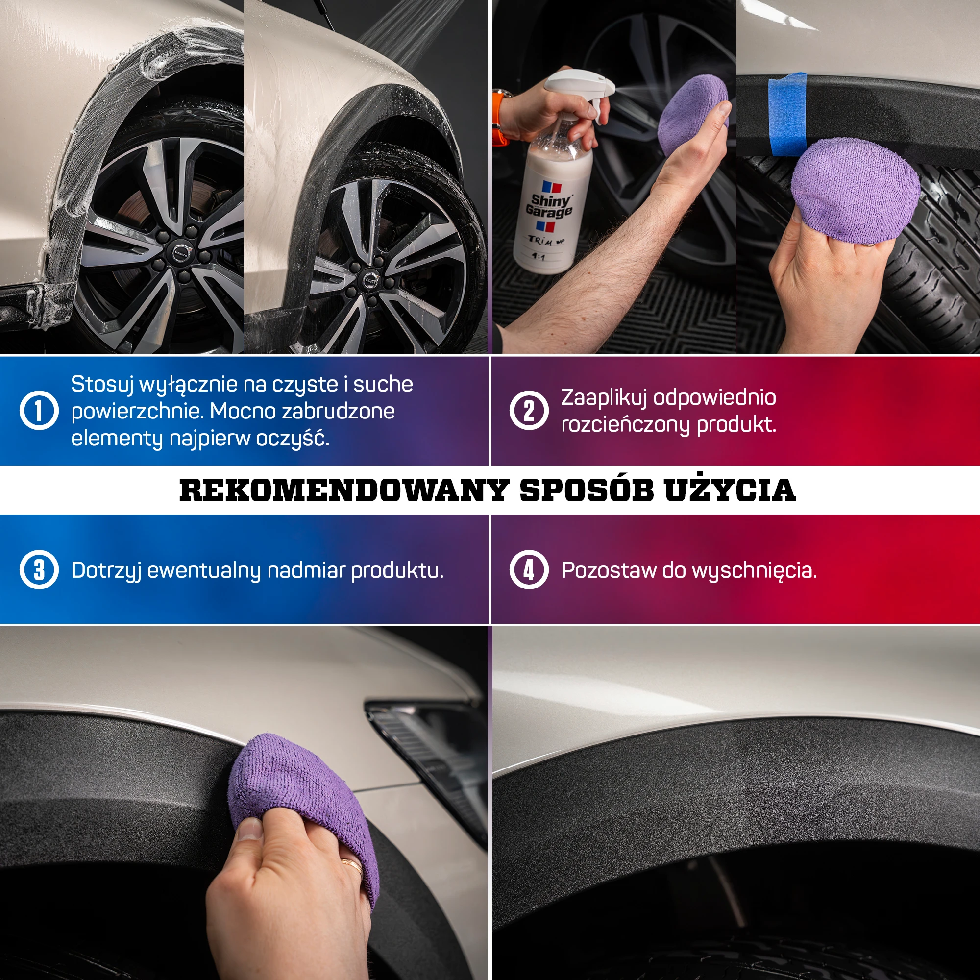 - Aplikuj na plastiki zewnętrzne (np. nadkola, komora silnika) mikrofibrą lub aplikatorem.