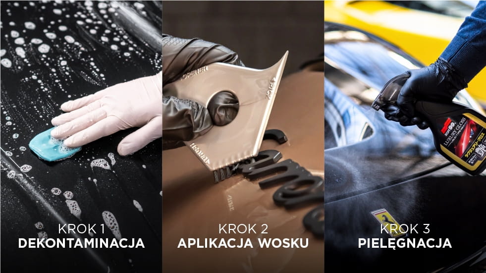 Przed nałożeniem wosku zadbaj o staranne przygotowanie powłoki lakierniczej, czyli dekontaminację. Jest to wieloetapowe czyszczenie lakieru, które pozwala usunąć wszelkie zabrudzenia, zanieczyszczenia i pozostałości po wcześniejszych produktach, a tym samym zwiększa przyczepność wosku.